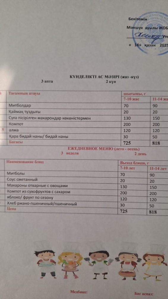 1-4 сынып оқушылары мен жаппай қамту есебінен тегін тамақтанатын оқушыларға 14.10.2025ж арналған күнделікті ас мәзірі Мәншүк ауылы ЖОББМ