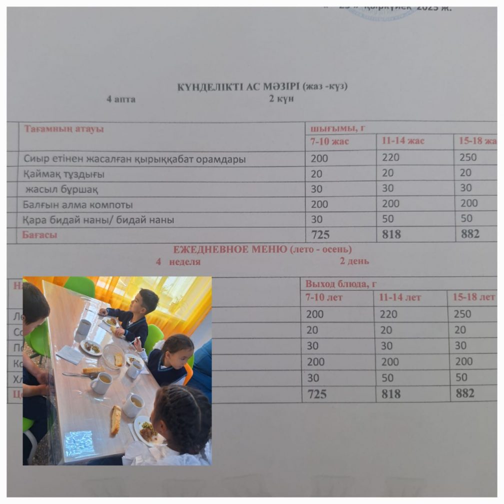 1-4 сынып оқушылары мен жаппай қамту есебінен тегін тамақтанатын оқушыларға 23.09.2025ж арналған күнделікті ас мәзірі Мәншүк ауылы ЖОББМ