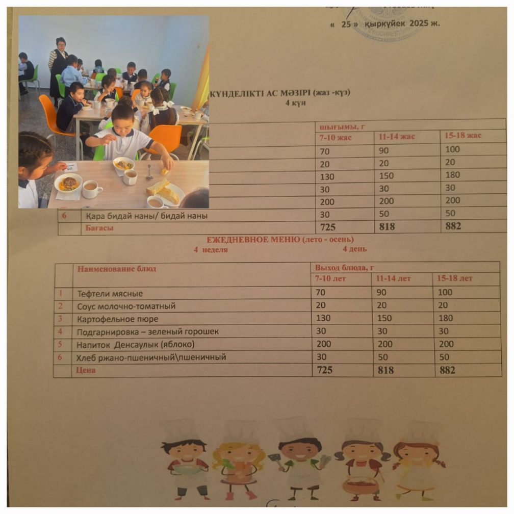 1-4 сынып оқушылары мен жаппай қамту есебінен тегін тамақтанатын оқушыларға 25.09.2025ж арналған күнделікті ас мәзірі Мәншүк ауылы ЖОББМ